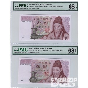 1983년 나 1000원권(2차 1000원) 음성기호 쌍둥이번호2매 / PMG 68등급EPQ