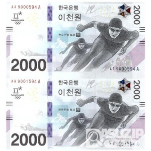 2018년 평창 동계올림픽대회 기념은행권 2000원권 2매 연결권/ AA 9000593 A