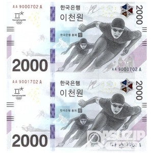 2018년 평창 동계올림픽대회 기념은행권 2000원권 2매 연결권/ AA 9000702 A