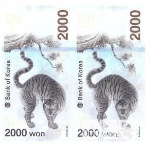 230만장 한정 발행한 액면 최초 2천원권으로 2매 연결형 지폐 첩입니다.