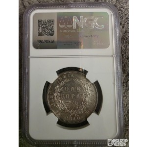 뒷면: 월계수 관 안에 "ONE RUPEE"와 페르시아어(우르두어)로 "Yek Rupiya"가 적혀 있으며, 바깥쪽에는 "EAST INDIA COMPANY"와 연도 "1840"이 새겨져 있습니다.