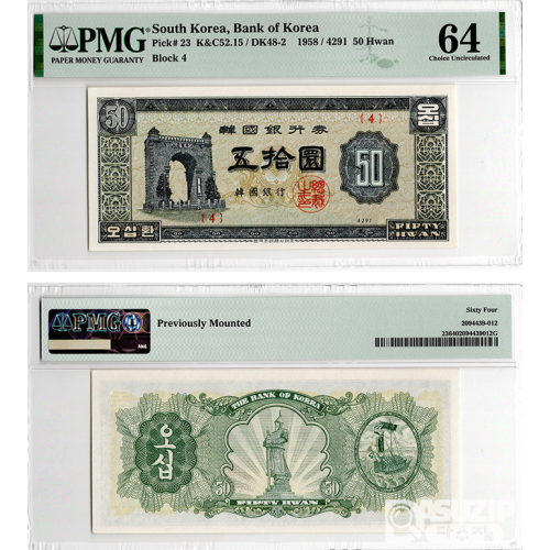1958년 50환권(독립문) 판번호 4번/ PMG 64